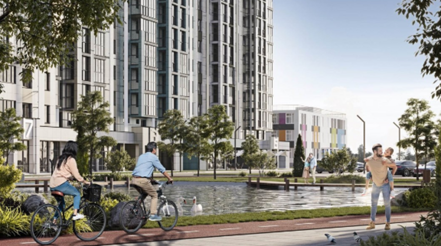 Зелёные зоны, велодорожки и набережная у искусственного водоёма делают двор местом для активного отдыха и общения.