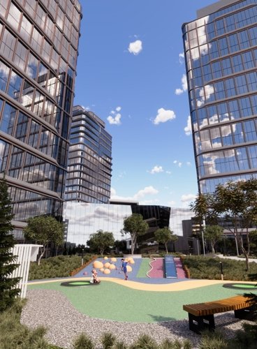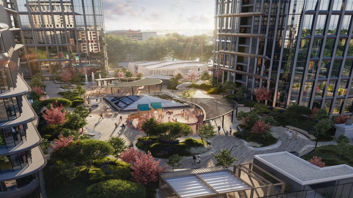 Внутреннее пространство комплекса включает в себя зеленые зоны, детские и спортивные площадки, а также зоны для отдыха